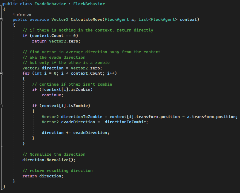 An example of the code I wrote in this project from the EvadeBehavior class: