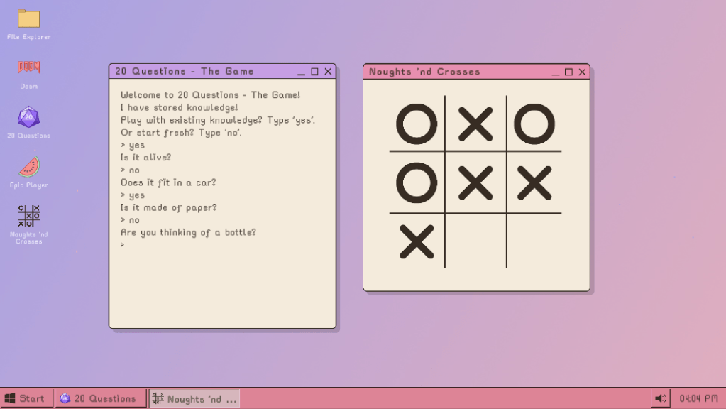 ‘Treespire’ focusses on implementation of trees as AI in games. In this game, the user operates a computer which can play multiple programs. The two programs above, each implement trees in some way. For ’20 Questions’, the program tries to guess what the user is thinking about by asking questions. In the other program, ‘Noughts ‘nd Crosses’ , the program tries to outsmart the player and win the famous game.