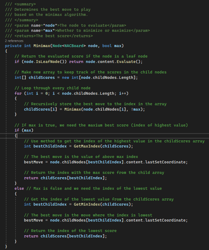 To make these programs work as intended, I had to work and experiment with a few classes regarding trees. My main input for this project was the implementation of a minimax function for the ‘Noughts ‘nd Crosses’ program. In this function, the program needs to calculate and store the best moves to play himself. This is what the function looks like: