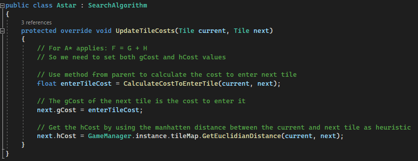 My job was finishing the algorithms so they perform correctly. By adding heuristics (weights) to the mix, the algorithms could behave differently. My implementation of the A* algorithm is as follows: