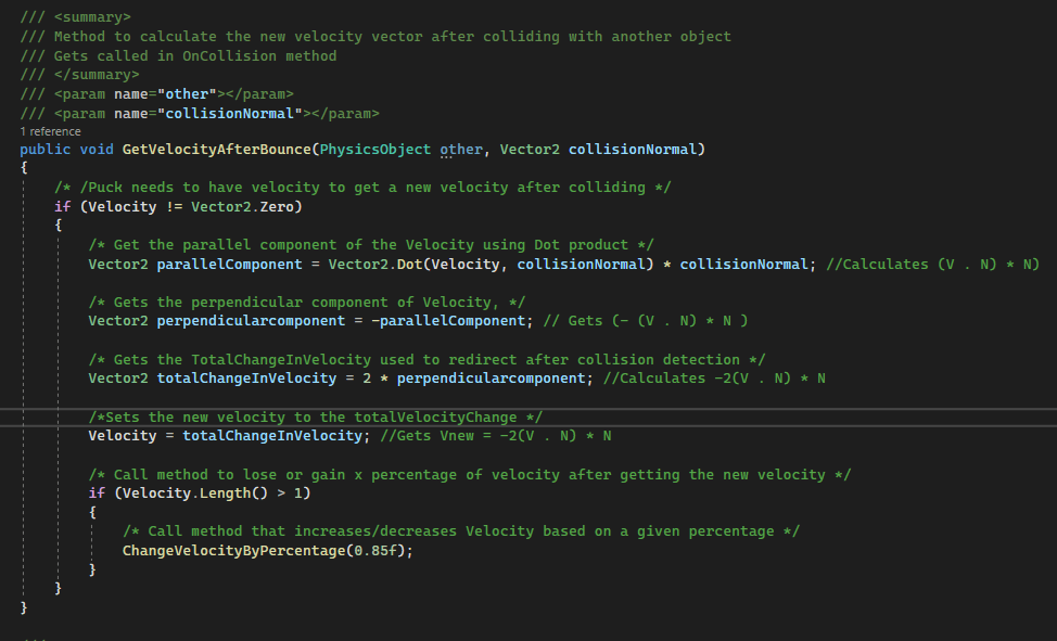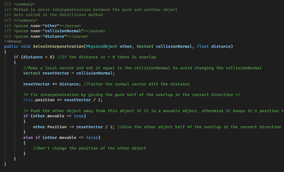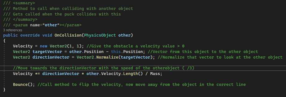 The OnCollision method solves the collision with the puck and other physics objects. In the method we get the collision normal, solve interpenetration and get a new velocity to make the puck move in a different direction with a new speed. We also call the OnCollision method for the object the puck has hit, this can be something like a obstacle to make it bounce for example. The SolveInterpenetration and GetVelocityAfterBounce methods look like this: