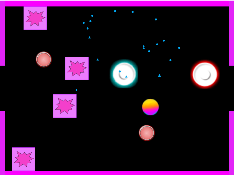 PhysicsObject in this project refers to a class which has a few variables and methods available that are relevant for objects that physics apply to. The class was not made by myself, instead it was included in the base project that students used for their projects. In case for this project, the objects seen below are all physics objects (Purple obstacles, red bumpers, blue/red pushers, rainbow puck).