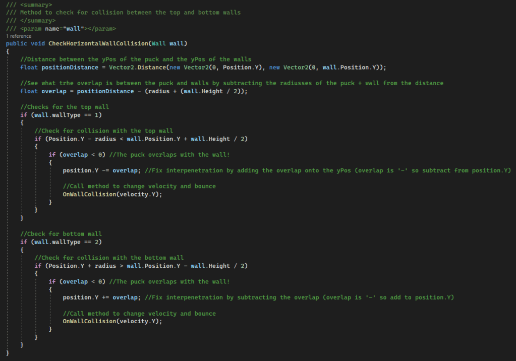 We handle and check for collision with walls separately, because the walls in the project have a constant position and don’t need to change or apply physics to them. To do this, we have a few functions to check for collision and act upon collision. We have two methods to check for collision with the walls, one for the horizontal placed walls at the top and bottom of the screen, and one for the vertical placed walls at the left and right side of the screen. These methods are nearly identical, the only difference between them is the component of the position vector that gets used to get the difference in position (x for vertical walls, y for horizontal walls). This is what it looks like: