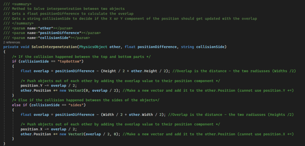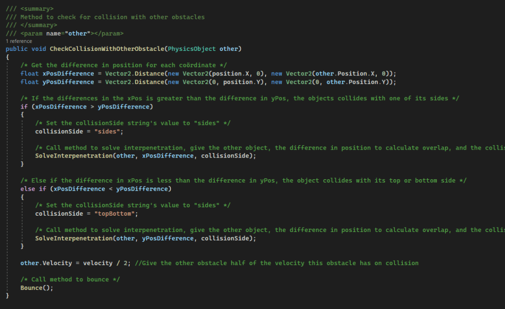 The puck checks for collision with PhysicsObjects and walls. It does this seperately, because the walls are objects that don’t need to have physics applied to them and don’t move. Therefore, I made seperate methods for colliding with PhysicsObject and walls. First, let’s look at the collision with PhysicsObjects.