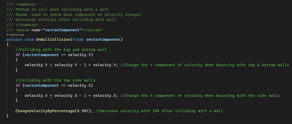 The OnWallCollision method takes a parameter to decide what component of the puck’s velocity needs to be changed. Inside the method, the velocity component gets flipped to make the puck move in the opposite direction. The method looks like this: