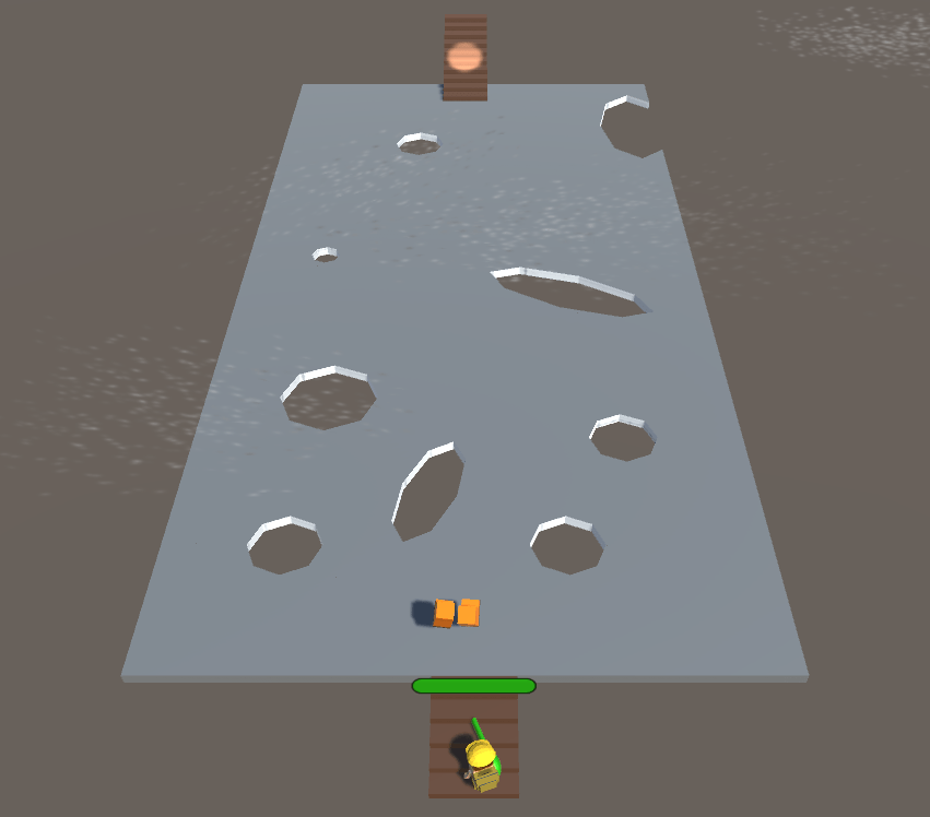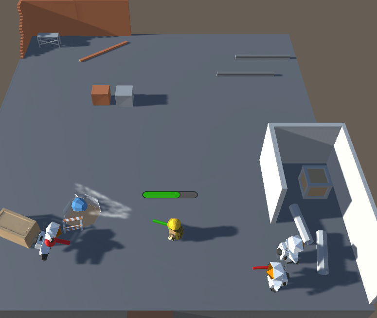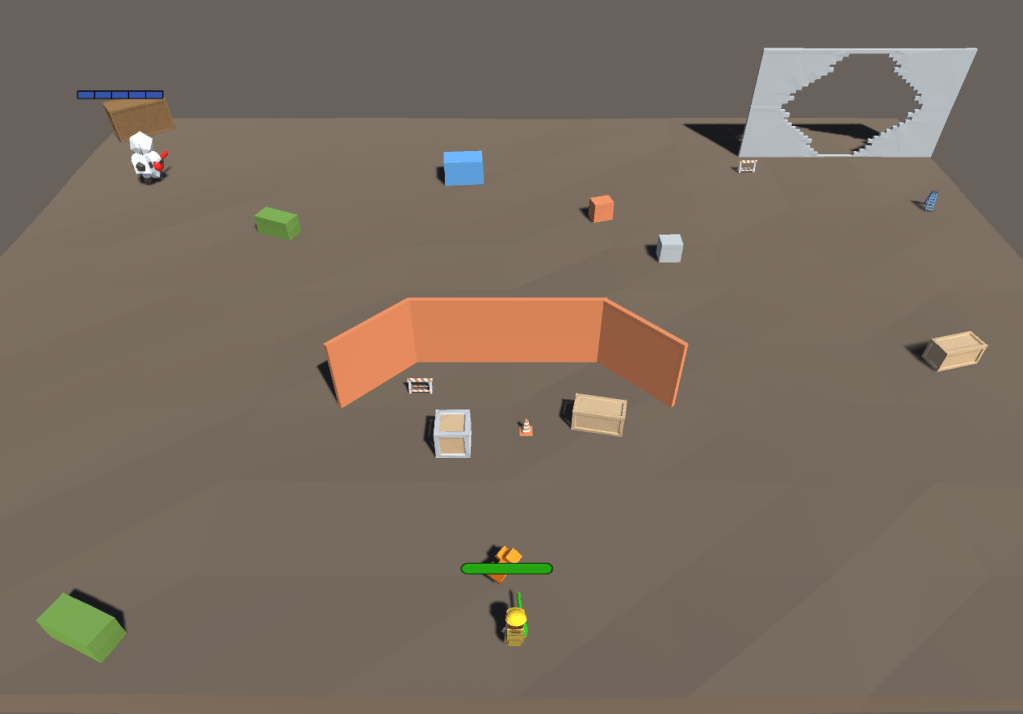 The last level introduces a boss fight wherein the player can showcase his control over the various mechanics. The boss has a blue bar above his head, that serves as his armor. The player’s goal is to blow the enemy off the platform. Using obstacles to hit the enemy, the player can lower the armor of the boss, making him lighter and easier to blow away. The boss operates in different states depending on the amount of armor he has. He can patrol, fire towards player, chase the player and run aggressively towards the player’s position. After the player successfully blows the boss off the platform, he gets taken to the win screen where he can restart the game from the beginning.