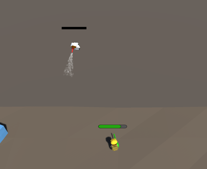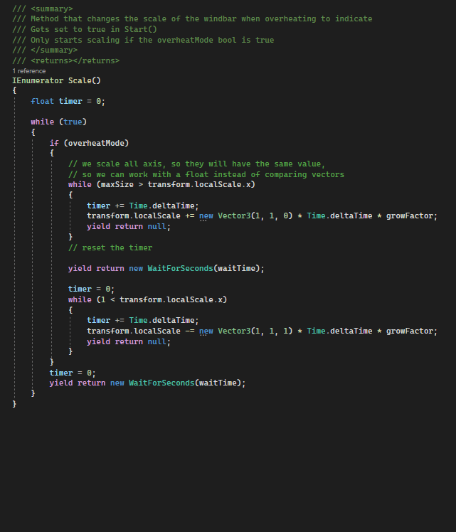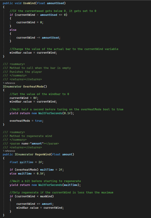 Next, I’d like to share my implementation of a healthbar-like component. The player has a bar attached to him, the so called windbar. This bar keeps track of how much wind the player can use. The windbar regenerates automatically when the player is not firing, and has a few other elements to it. The windbar’s color changes based on what the value inside is. It goes from green to orange to red. While in the green zone, the windbar regenerates a lot faster than the other zones. In the red zone, the regeneration time is much more delayed and slower. I want the player to manage his ammo in a rewarding way, punishing them if they use too much (negative feedback loop). To fully punish the player, the weapon will not be usable when completely running out of wind. When this happens, the player moves slower, cannot use his workboots and his weapon needs to recharge. To indicate when this happens(called overheatMode), the windbar will grow and shrink rapidly to get the attention of the player.