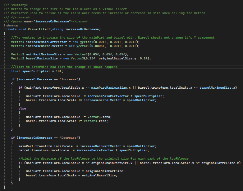 For the visual que, I would like to grow the size of the leafblower before firing, then decrease smoothly back to original size when the particles start. I make a method for this, called VisualEffect, that increases and decreases the scale of the leafblower’s objects (the barrel and the main part of the weapon). I use a few magic numbers after heavy testing to see what numbers work well visually. Since I don’t want to change these numbers later, I manually put them in a vector for this project.