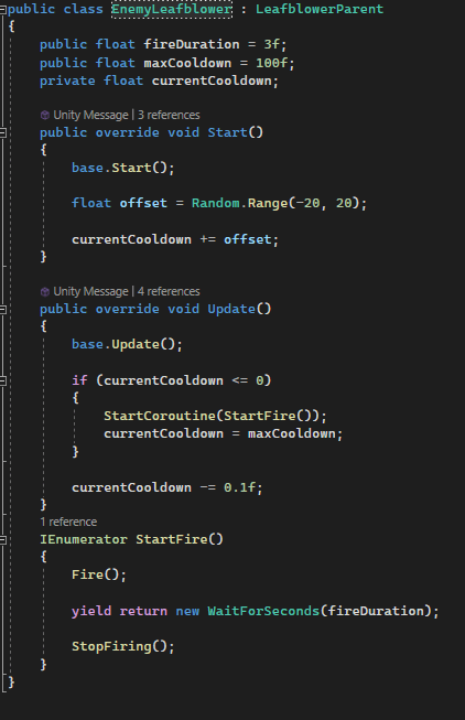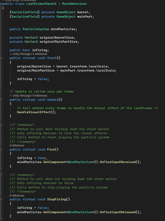 First, I’d like to share the scripts for my implementation of the leafblowers. I made a parent class for leafblowers that can be used for the player and enemies respectively. In this base class I want to handle the firing of the particles, as well as showing a visible que when a leafblower is about to start firing.