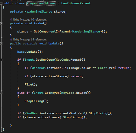 I make a seperate class for the player’s leafblower. In here we simply call the Fire and StopFiring methods based on the input. We use conditionals to see if we do not have a red windbar (will come back later) or if we are currently using our workboots mechanic. If these checks are okay, we can fire our weapon.
