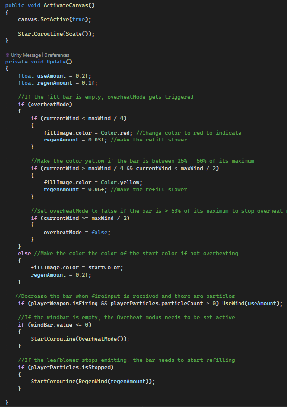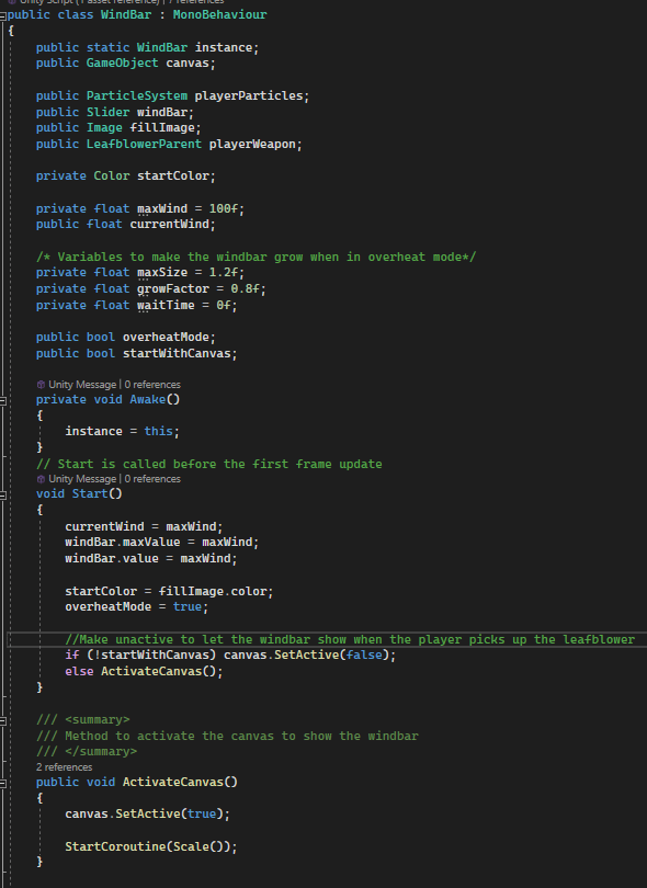 Finally, I’d like to share my scripts for activating the leafblower’s particles and for the collision detection. The WindParticles script looks like this: