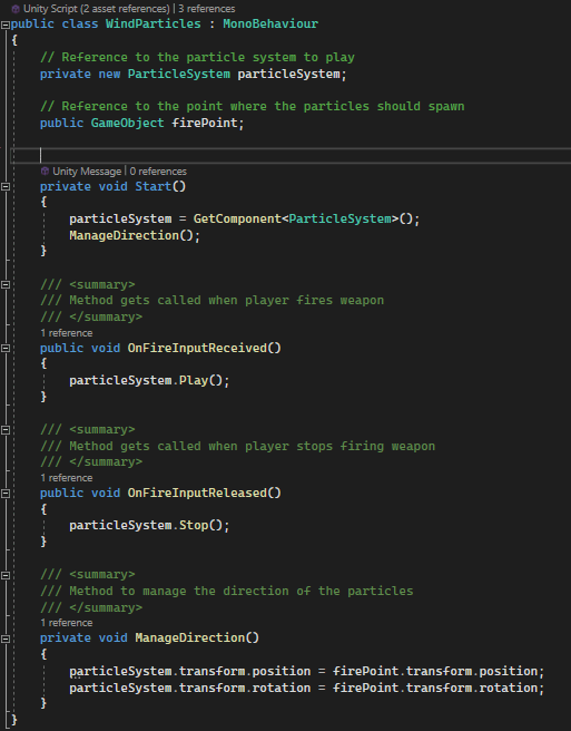 First I create the class and make two methods that can be overridden to use for firing the weapon. In these methods, I get a reference to the class that handles the particles of the wind, and call the method to start/stop the particles.