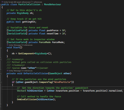 I’ve made a script for the collision with the particles of the leafblower. Because I want objects to be able to be pushed away, I create a custom script that I will add to every object that will be pushed away. I do this so I can modify the values of each object individually if needed, such as the push force and the force mode. I also make this script so I can apply it to enemies and the player as well, while being able to modify its values if needed. Here’s what I made: